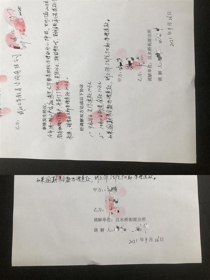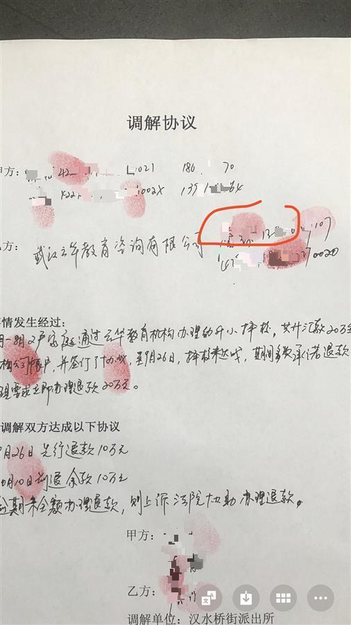 9月底,两名家长前往辖区派出所报案。在派出所调解下,双方签了调解书。调解书约定在9月26日退款10万元,10月10日退款10万元。极目新闻记者发现,此时,在调解书上签字的并不是詹林西,而是詹琼。李涛告诉极目新闻记者:“当时,我们也觉得很奇怪,但当时自己也没有多想。”