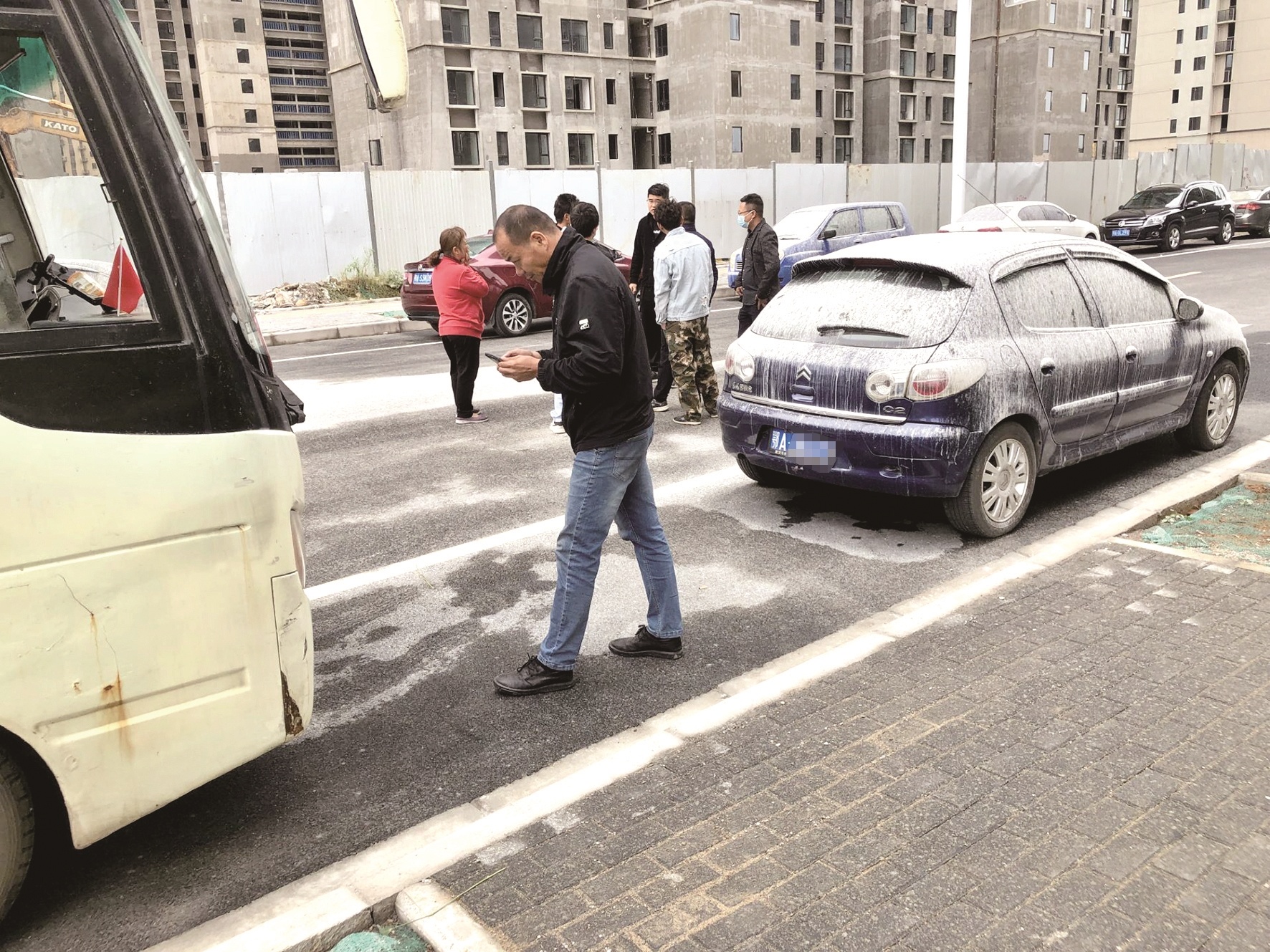 车主韩先生告诉记者:“10日下午3时30分左右,工地正在施工。当时风比较大,楼上突然飘下大量水泥浆,有的落到了车上。”由于发现得早,他赶紧把自己的车开到洗车店,花了200元,精洗了两遍,车身依然还留着水泥浆的痕迹,挡风玻璃上也有刮痕。昨日上午,韩先生和其他车主一道找施工方理论,希望施工方对受损车辆进行修复,或者给予车主一定的补偿,但双方未能达成一致。