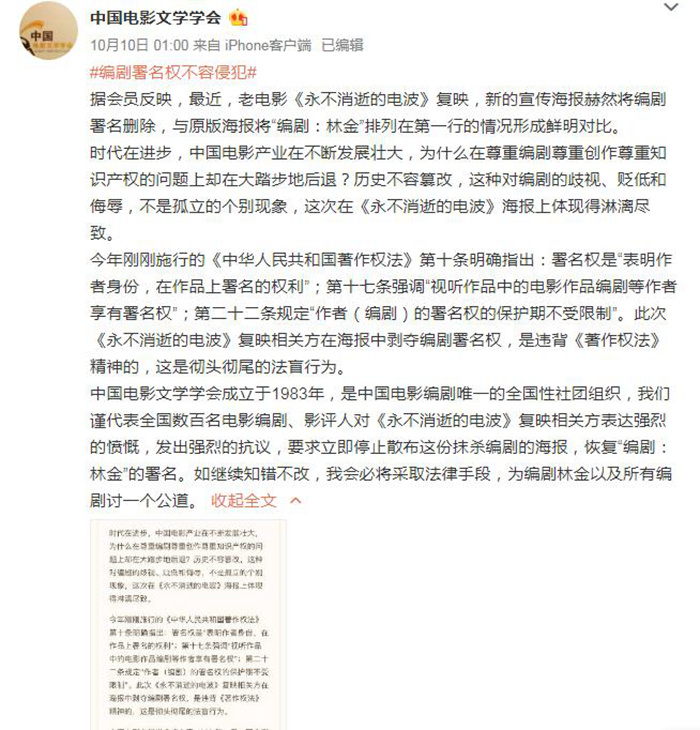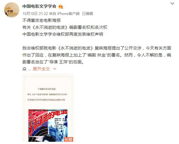 10月10日,中国电影文学学会维权部在微博发表《编剧署名权不容侵犯》,称近日复映的经典电影《永不消逝的电波》海报将编剧署名删除,与原海报将“编剧:林金”排列在第一行的情况形成鲜明对比,要求相关方立即停止散布海报,恢复编剧署名,否则将采取法律手段。