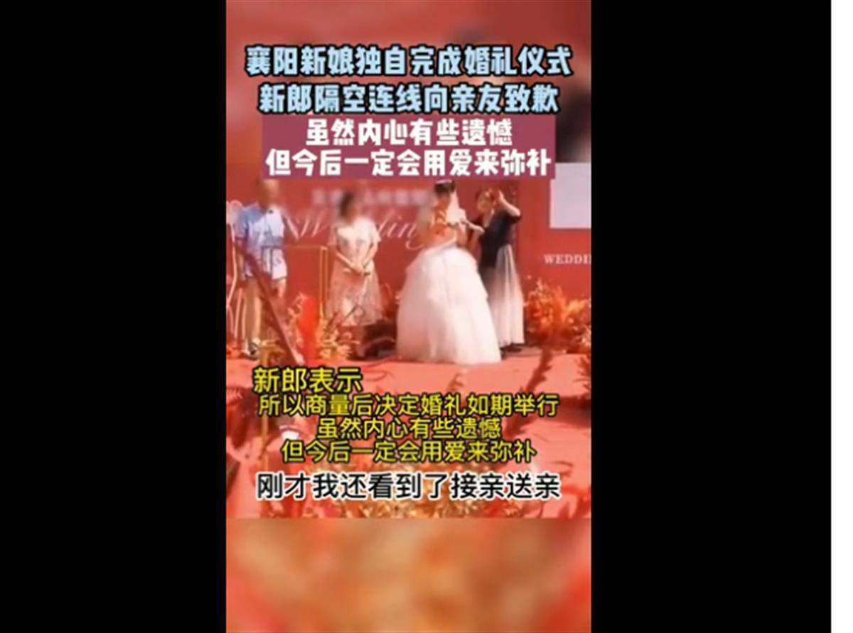 据发布的视频显示,10月2日中午12时,襄阳宜城市王集镇举办了一场博士与硕士结婚的婚礼。楚楚动人的新娘在众多亲友的簇拥下走上了婚礼舞台。可是,热闹的婚礼现场,新郎官却没有出现。正当人们诧异之时,新娘的手机里传出了新郎的致歉声“各位亲友,很抱歉,我以这种方式举行婚礼,和大家见面……”新郎说,他想过很多种出场方式,却没想到以这种方式出现在婚礼上。事实上,他本人就在距离婚礼酒店半个小时车程的地方。