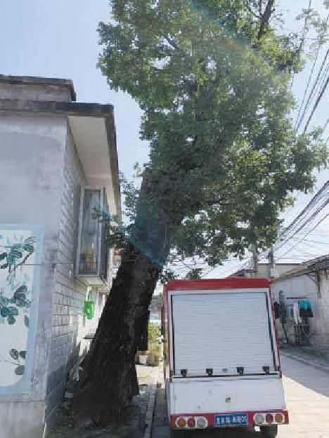 三家店村紧挨着古树树基建起房屋,古树出现倾斜。