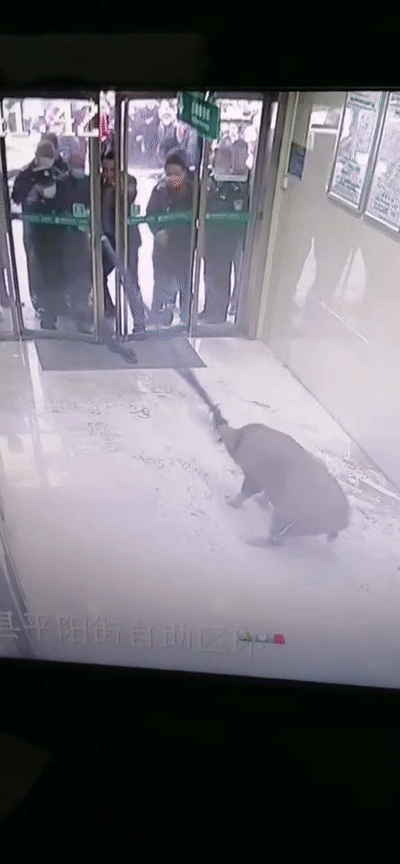 10月12日,陕西宝鸡市眉县平阳街一银行的自助服务大厅中发现一只野猪。随后,当地公安和林业局工作人员一起将之制服并带走。