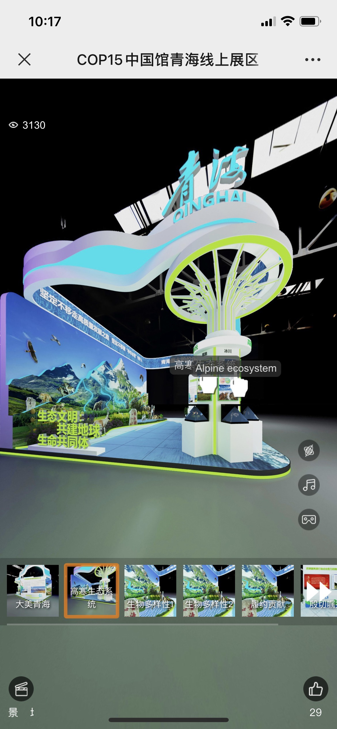 青海展区以“为共建地球生命共同体贡献青海力量”为主,通过三部分内容,以展板、专题片、视频和多媒体互动等多种形式,广泛传播青海复杂多样的高寒生态系统、独特的野生动物、丰富的野生植物、生态文明建设成果、绿色低碳发展方式等,展示青海省生物多样性保护方的成果特色,展现“大美青海”的靓丽形象。