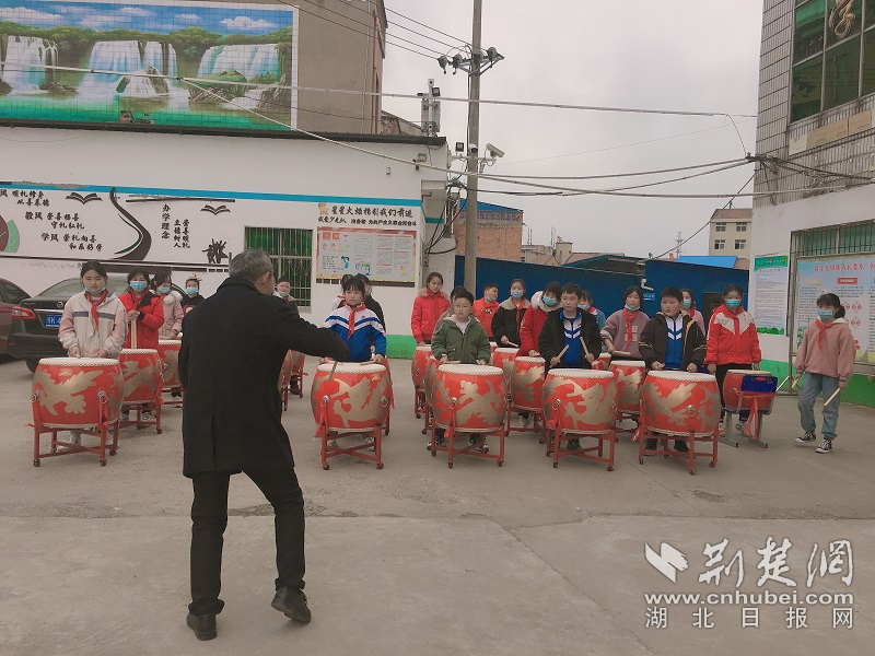 孩子们正在跟着老师学击打腰鼓。通讯员周蓓 摄