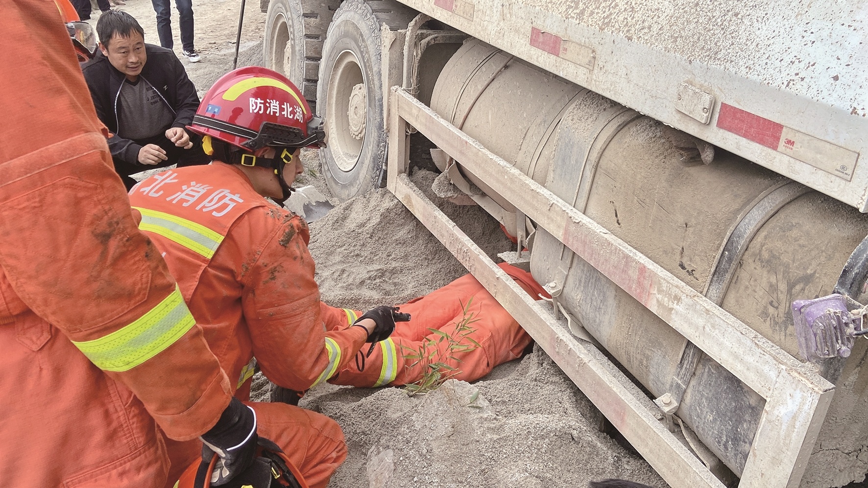 经过与现场各方协调,当地政府迅速调集一台吊车到场协助救援。消防人员根据现场被困者情况立即展开营救。首先使用液压破拆器材对事故车辆驾驶室进行破拆,解脱出被困者右脚,使其呈卧姿,防止长时间倒立头部充血,随后使用工兵铲、铁钎等工具对水沟进行挖掘扩大救援通道,期间不间断对伤者进行安抚。吊车准备就绪后将货车缓缓吊起,打开救援通道,最终驾驶员被成功救出。