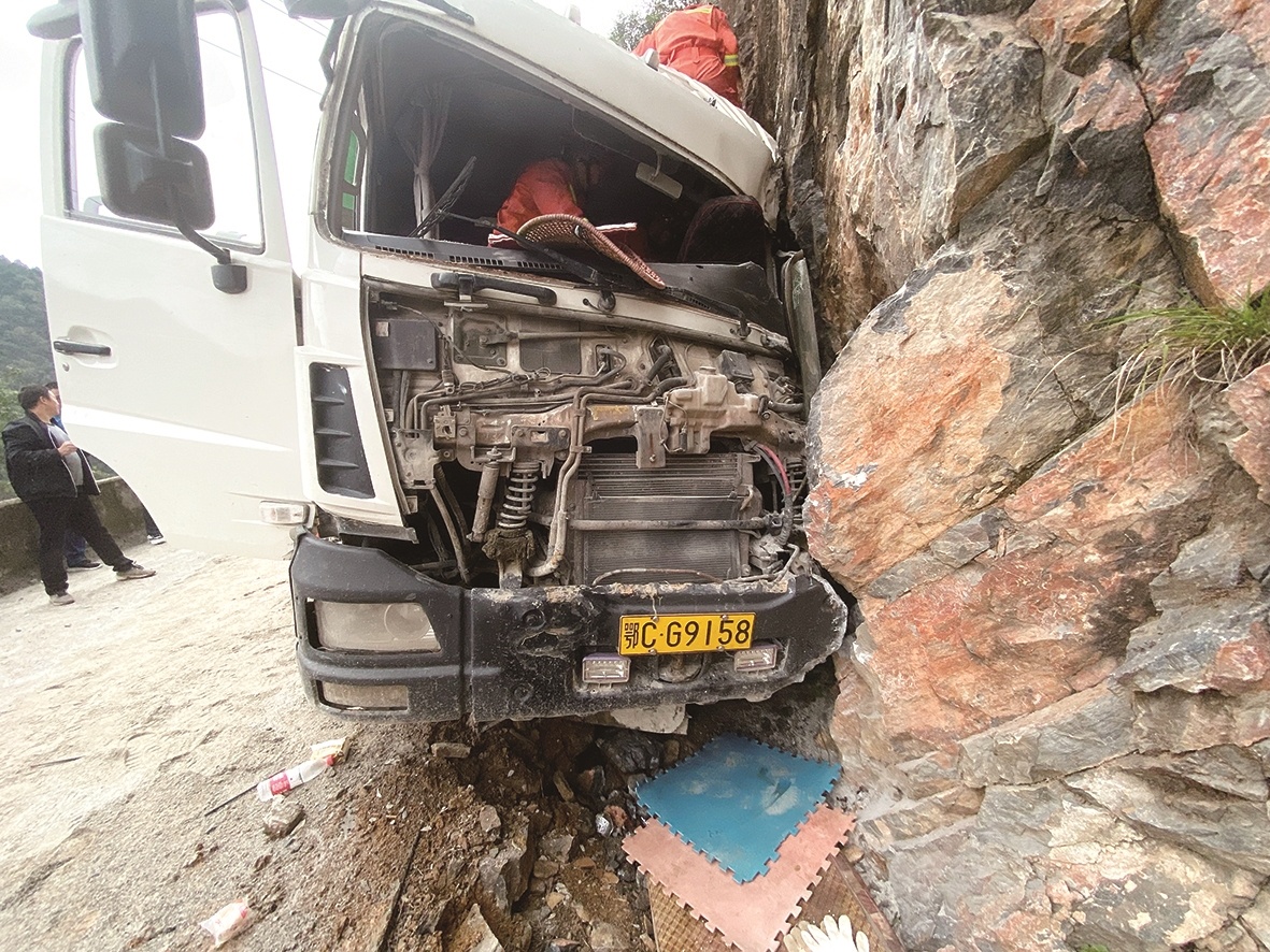 楚天都市报极目新闻讯(记者关前裕 通讯员王霞 宋龙)10月12日上午,一辆运载沙子的货车在郧西县三官洞林区杨家老庄附近乡道撞上崖壁,驾驶员被困,情况紧急。