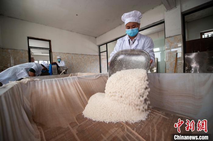 工人正在舀蒸好的糯米饭。 吴德军 摄