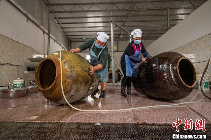 从江县一家煨酒企业车间,工人正在清洗酒缸。 吴德军 摄