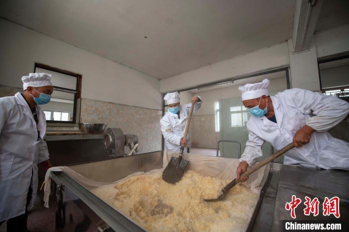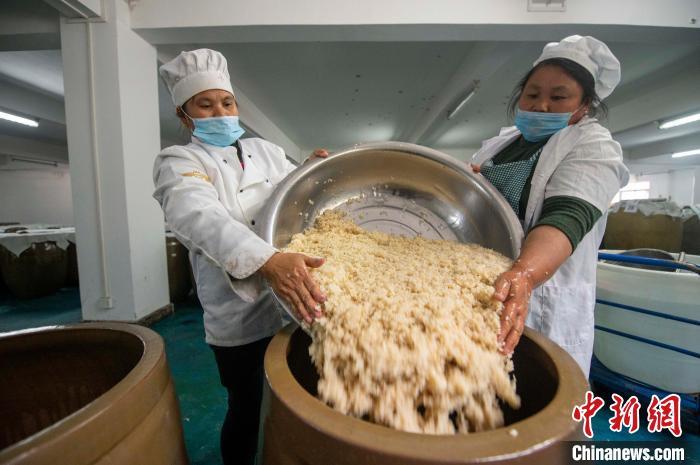 工人正在将搅拌好的糯米饭入缸发酵。 吴德军 摄