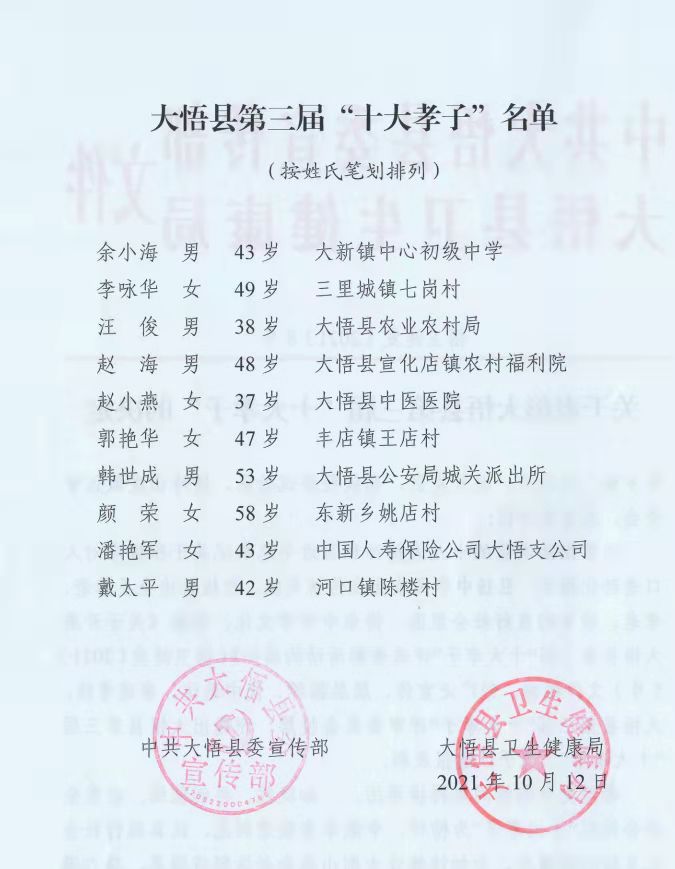 据悉,2019年开始,大悟县委宣传部、县卫健局连续三年开展“十大孝子”评选表彰活动,受到社会广泛关注与好评。