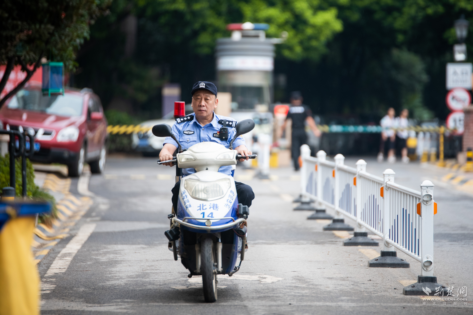 10年来,他已经把自己当作学校的一名保安,几乎每天都会在上午7点准时出现在校门口,一直等到上课铃敲响,他才骑着自己的电动车回到警务室工作。