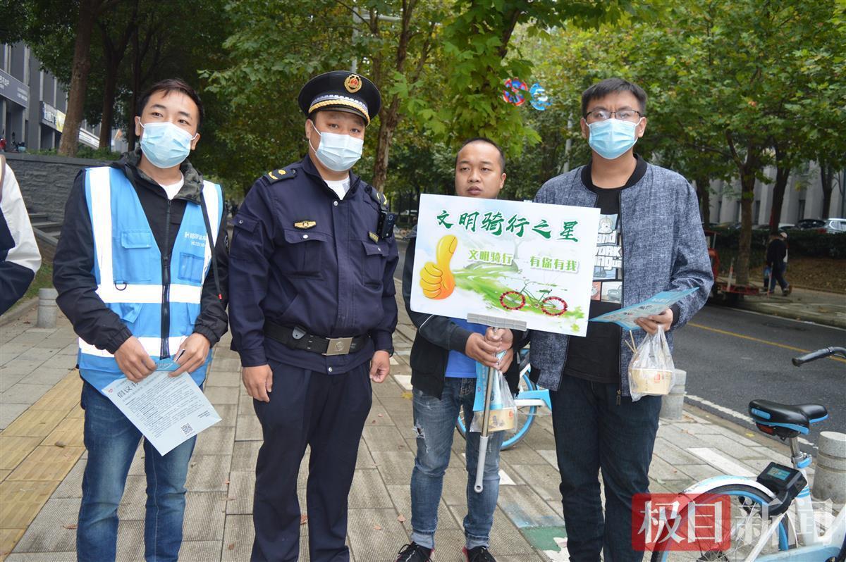 14日,东湖高新区城管局联合共享单车企业开展寻找“文明骑士”活动。城管队员和单车企业员工走上街头,寻找文明骑行,规范停车的市民,送上免费骑行月卡。