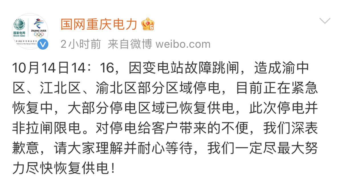 极目新闻注意到,14日下午3时12分,国网重庆市电力公司官方微博称,10月14日14:16,因变电站故障跳闸,造成渝中区、江北区、渝北区部分区域停电,目前正在紧急恢复中,大部分停电区域已恢复供电,此次停电并非拉闸限电。14日下午4时,国网重庆市电力公司官方微博表示,截止14日14时48分,因变电站故障跳闸的渝中区、江北区、渝北区停电区域已恢复供电,感谢市民的关注和理解。