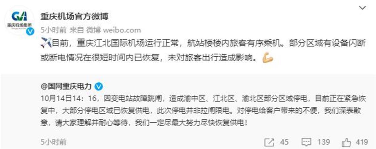 10月14日下午,重庆市部分区域停电。对此,重庆机场集团有限公司称,机场部分区域短时停电,未对旅客出行造成影响。