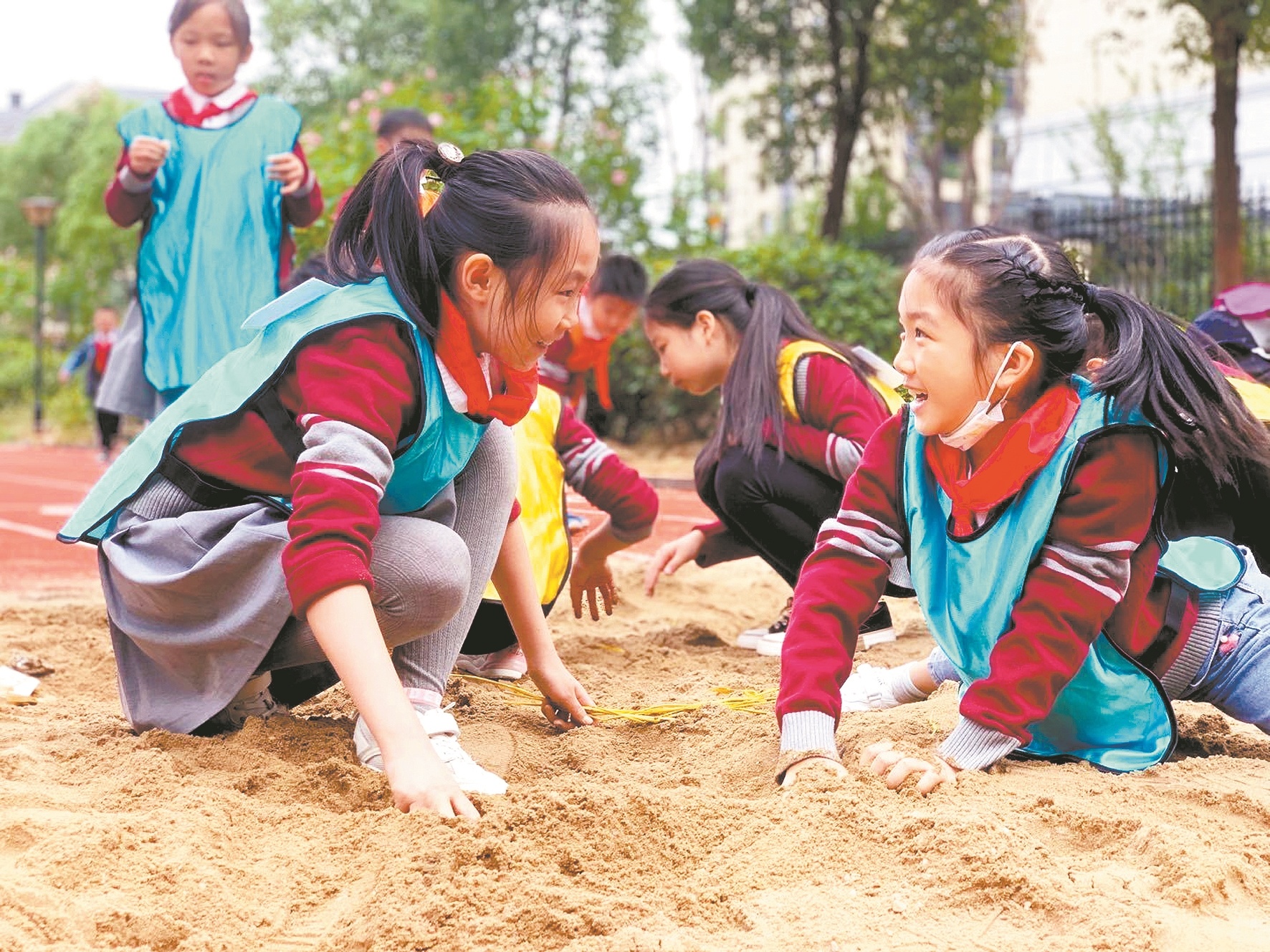 春种秋收活动上,该校一二年级的学生在操场上列队,排头的学生一马当先将“种子”依次放到指定位置,完成“春种”。之后队员们依次把“果实”收回箩筐,完成“秋收”接力。在该校的沙地,参加寻宝大挑战的学生们分为四组,穿上不同颜色的衣服,等待老师一声令下冲进沙地,寻找与衣服颜色对应的土豆、芋头、花生、红薯等作物。通过在沙地里“寻宝”,体验收获的快乐。