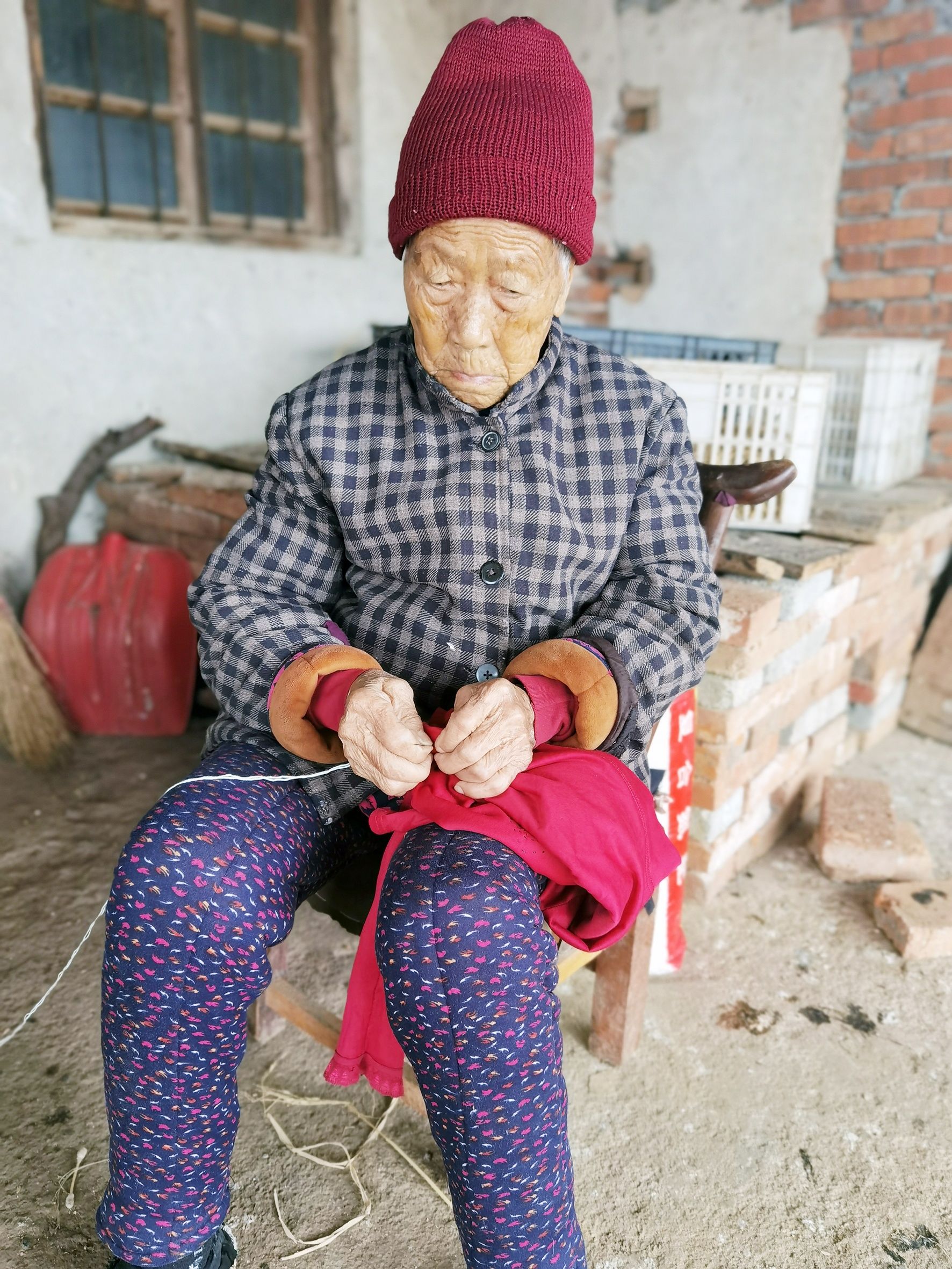 在长寿镇曾坡村,李德秀老人坐在家门口缝补衣服。她生于1921年,刚刚过完100岁生日。