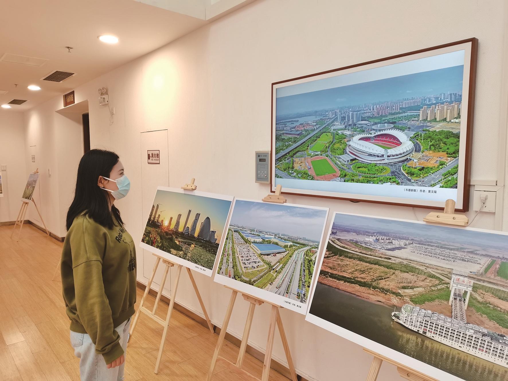 记者抬头注意到,园区建筑物上结合了武汉长江大桥的建设缩影。馆内布设书画摄影展,不少老年人前来锻炼。