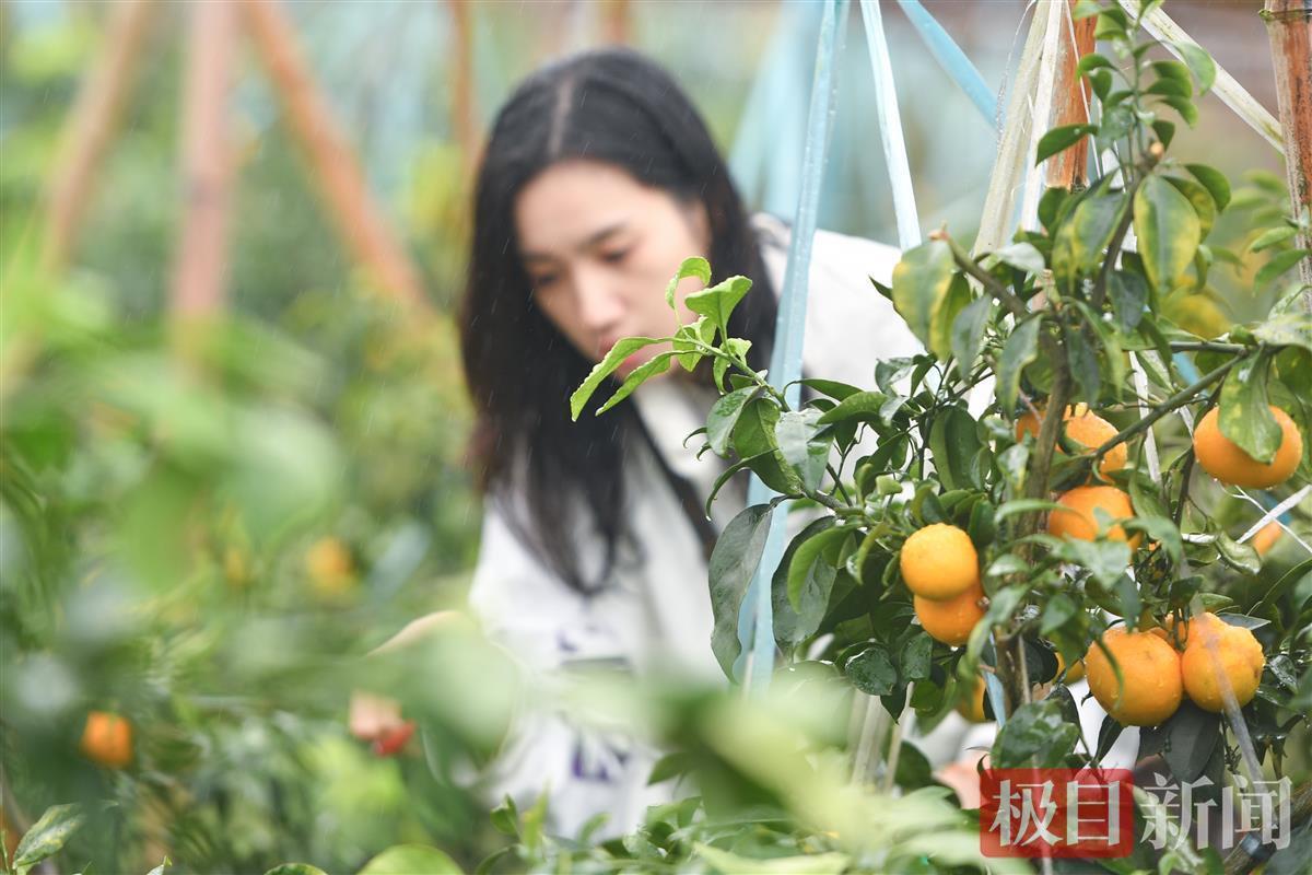 眼下,柑橘园迎来了它一年最美的时光。极目新闻记者现场看到,青龙山畔,彩旗飘扬,采摘节的招牌旗帜迎风飘展。柑橘园里的柑橘黄灿灿地挂在枝头,令人垂涎欲滴。