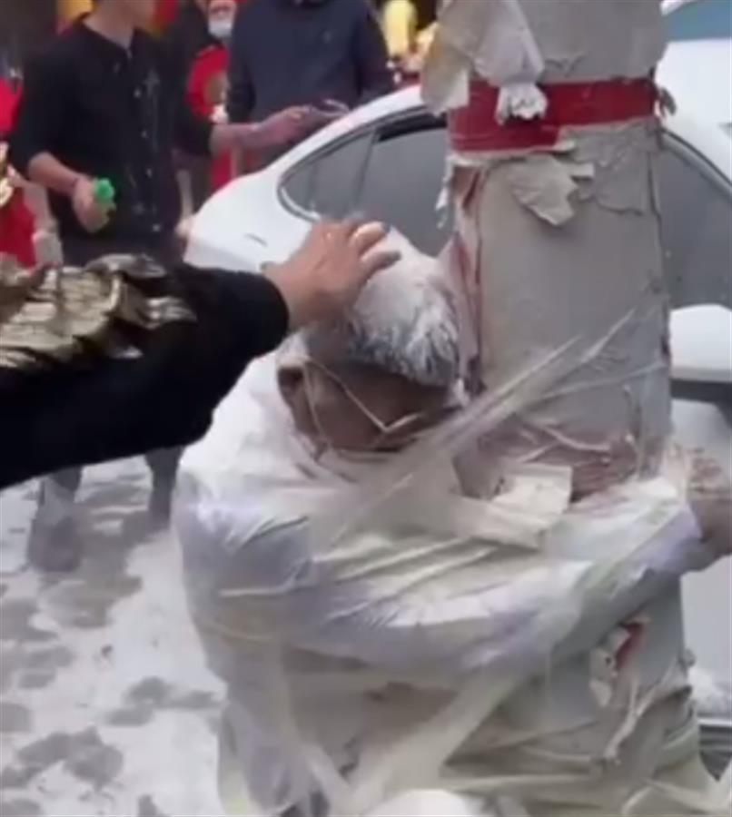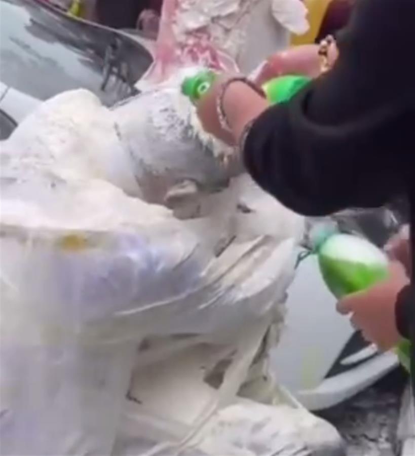 视频显示,在一酒店门口,一位新郎戴着墨镜和口罩,被人绑在树上。两男子打开灭火器对着他直喷,新郎蜷缩起来,两人随后又将面粉和汽水泼向他,新郎几乎“面目全非”。