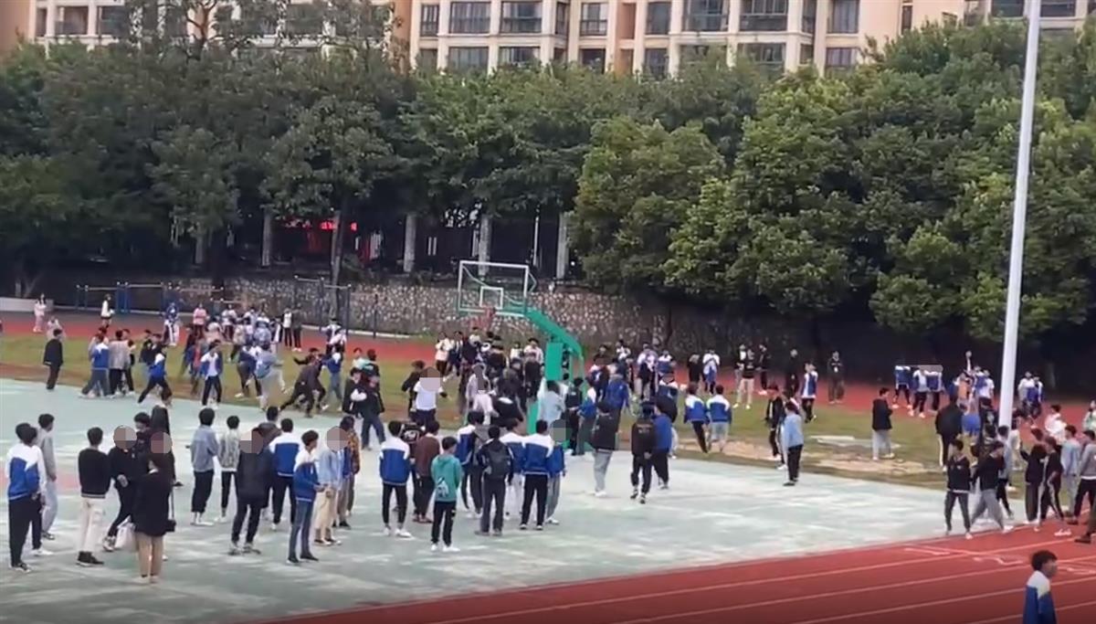 现场视频显示,多名身着校服的学生围在操场上,其中一名黑衣男生试图用脚踢踹另一名男生,被打男生向操场边逃跑,黑衣男生摔倒在地。另一段视频显示,多名学生厮打在一起,现场一片混乱,操场附近有多名学生围观。