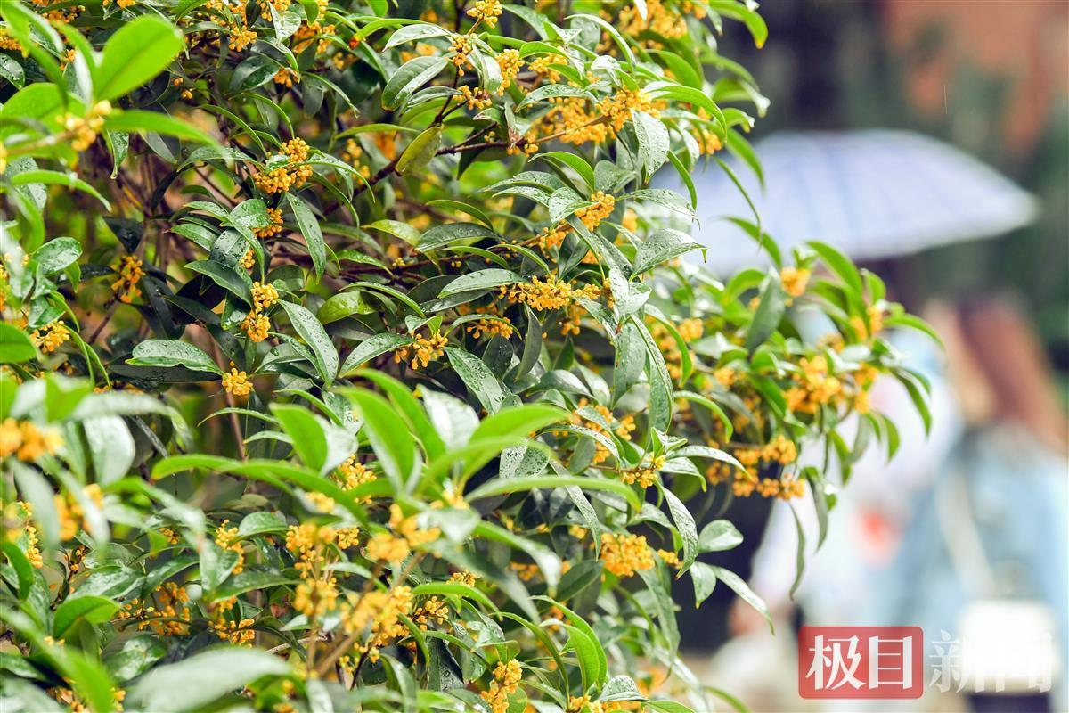 “闻到桂花香,心情格外好。”市民余女士特别喜欢桂花清甜的香味,特意冒雨到中山公园走走,只为吸这一口香气。