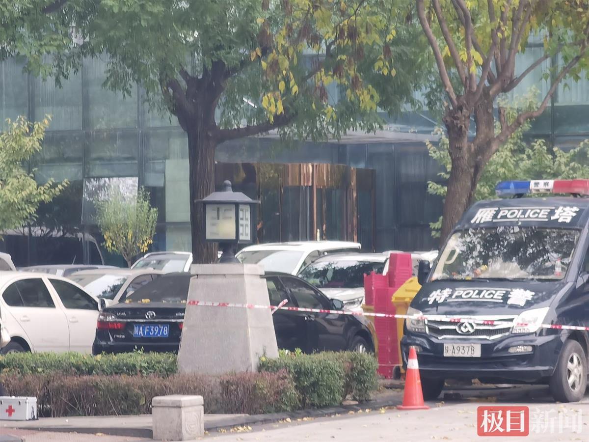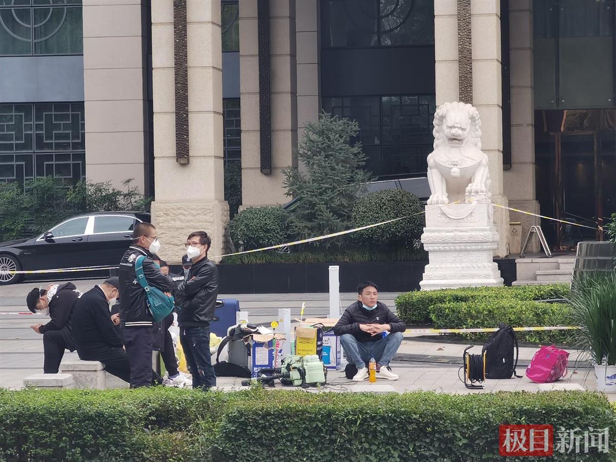 酒店大门外停放着多辆警车,多名民警在此值守,一旁设置了警戒线,提示行人禁止进入酒店。还有几名安保人员在地面停车场,为前来咨询的客人做解释,并引导还未入住的客人尽快办理房间退订。在酒店大门、侧门位置均有身着防护服的安检人员值守。