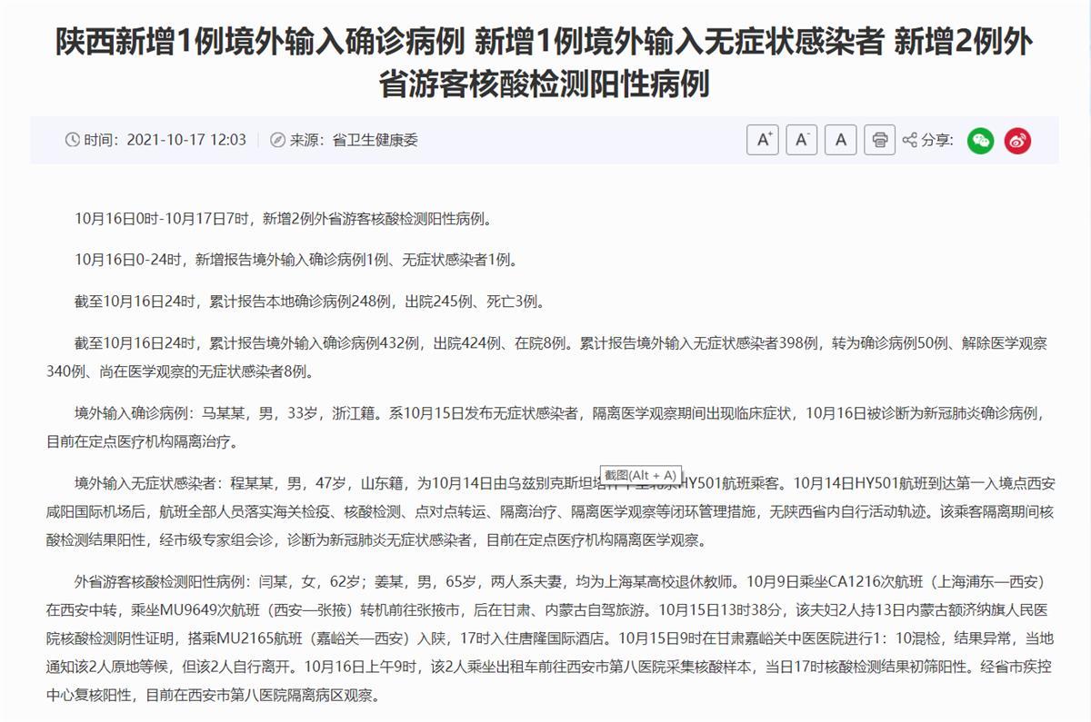 据陕西省卫健委消息,10月16日0时-10月17日7时,陕西省新增2例外省游客核酸检测阳性病例。