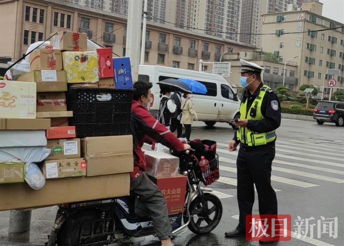 10时许,在发展大道新华路口,一辆满载货物的电动自行车晃晃悠悠向民警驶来,“师傅,你这属于违规载货咧!”按照《道路交通安全法》等相关法规,电动自行车载物标准:从地面开始起,不能超过离地面的1.5米,左右宽不能超过车把的0.15米,后端不能超过后端的0.3米,前端不能超过车轮。随后,民警对该车驾驶员依法处罚,并要求转运货物,确保安全。