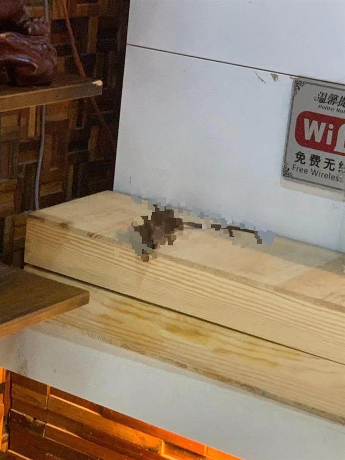 10月17日,小张致电极目新闻热线027-86777777反映,17日14时许,他在华农附近的美冒冒菜吃饭的时候,走到写有WIFI密码的墙面附近,准备连上店里的WIFI上网,结果突然看到墙面附近的木板上有一只灰色的大老鼠。
