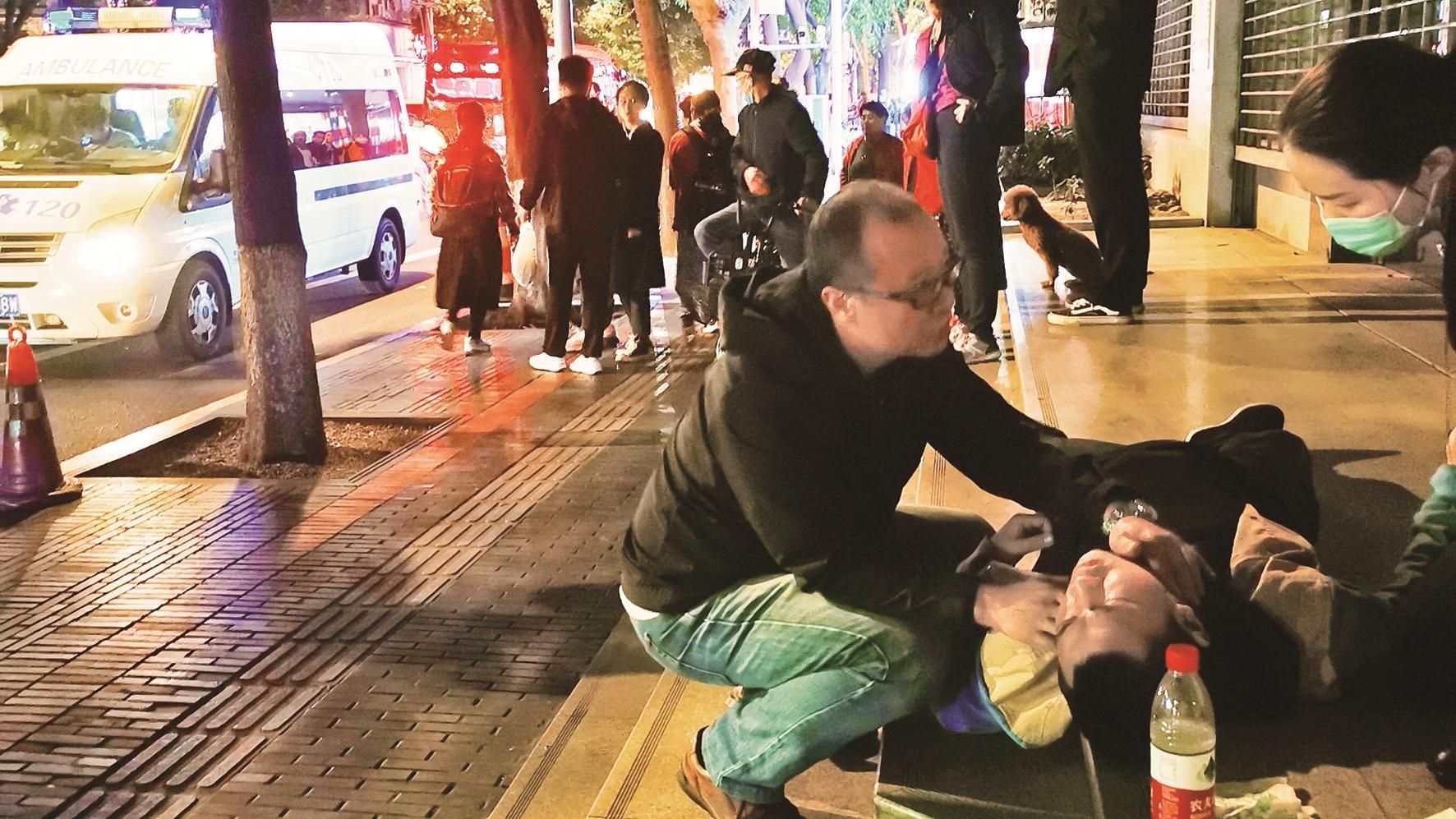 雨夜成都街头汉医跪地救人