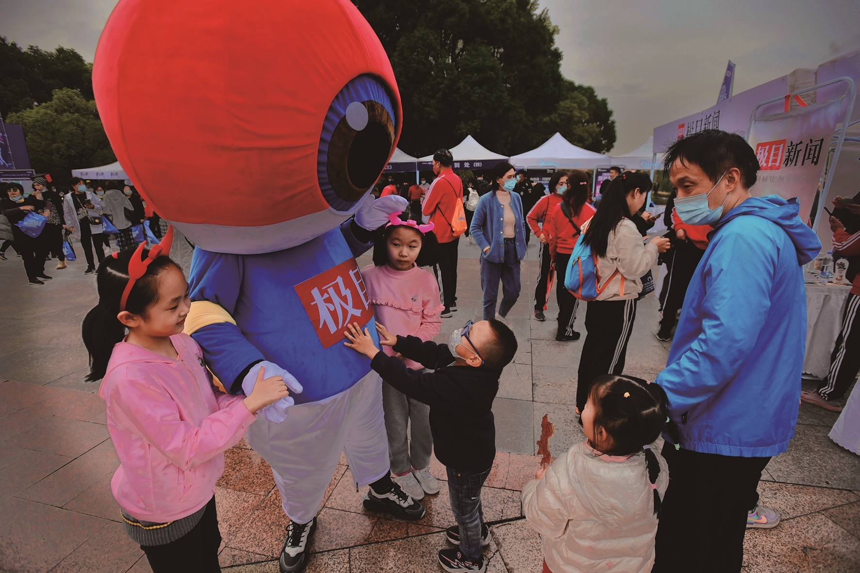 现场热闹的气氛也吸引了不少在附近游玩、遛娃的市民,他们纷纷与极目新闻吉祥物千里眼合影留念。