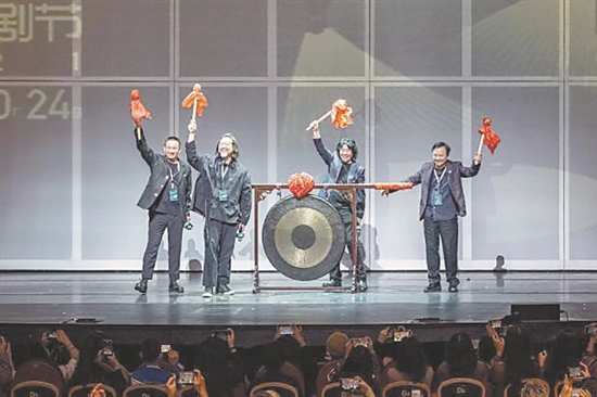 四位戏剧节发起人敲响开幕大锣