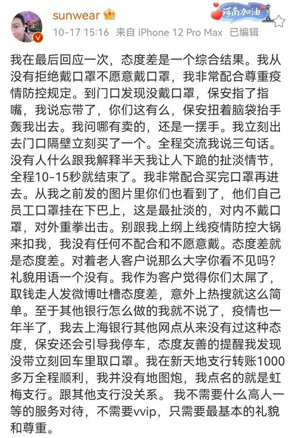 10月16日下午,大V@sunswaer微博上称,国庆前去了上海银行虹梅支行,从接电话的,到保安到职员,全都是一副你欠他的样子,尤其是保安(竟然能翻着白眼扭着头摆手轰你),说话也没有任何礼貌可言。且在博文中称,他不是顶级富豪,但也存了几千万,近一年这家银行流水近4亿。