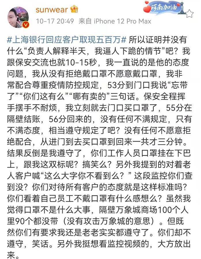 该大V称,此前在上海银行一网点办理业务,过程体验很不好,保安全程挥手摆手不耐烦,其后取走500万现金。