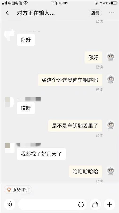与郝果一样,身在黑龙江省黑河市的商家刘女士也觉得不可思议。10月10日晚,刘女士收到一个威化饼混合口味的订单,价值29.9元。11日早上由于有别的事,刘女士在征求买家同意后未发货。12日一早,刘女士开车前往仓库,将买家需要的混合口味威化饼组合打包。“把货发出去后,正好有别的车来接我,当时就没有开车,12日晚我准备把车开回家,才发现车钥匙不见了。”刘女士说,由于当地没有奥迪4S店,配钥匙很麻烦,因此她在孩子上学的幼儿园门前、仓库、家里等到处找钥匙,都没有找到。