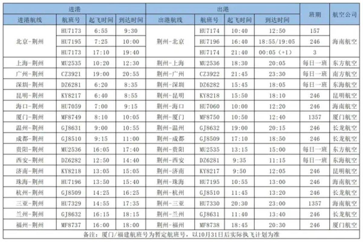 与此同时,从荆州至海南航班,原每周一三五七直飞海口,二四六直飞三亚,换季后将调整为每周一三五七直飞三亚,二四六直飞海口。