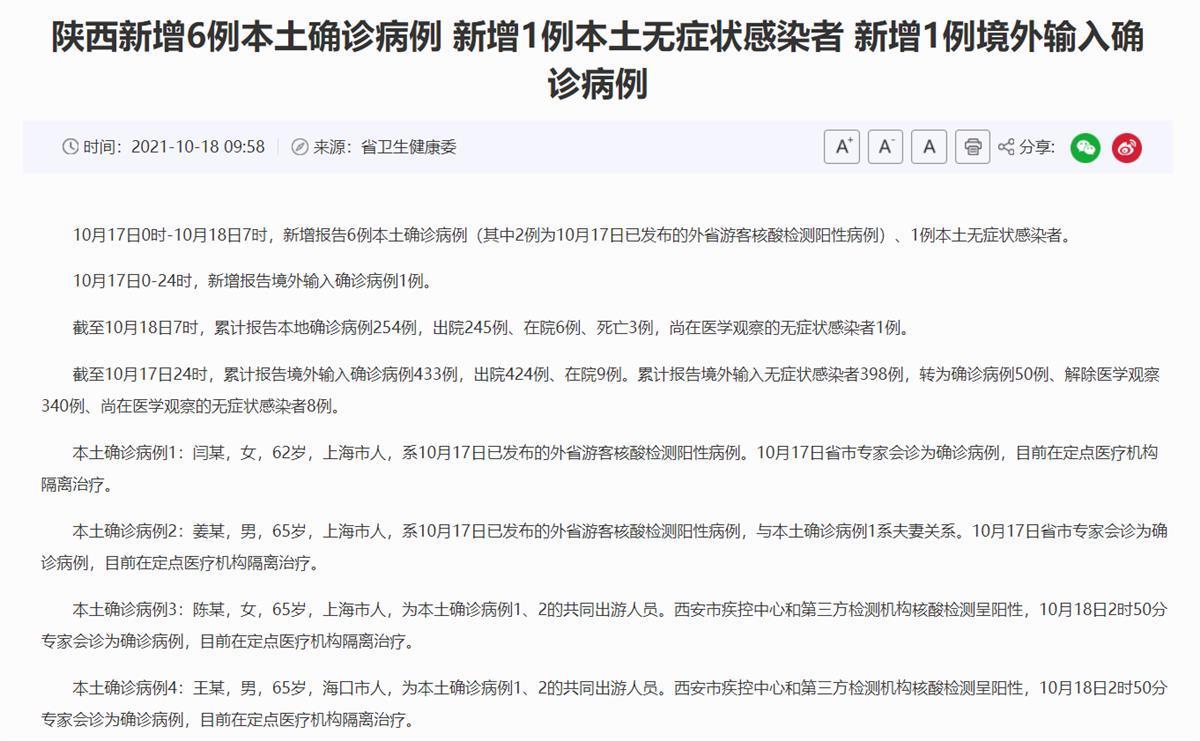 据陕西省卫健委消息,10月17日0时-10月18日7时,陕西省新增报告6例本土确诊病例、1例本土无症状感染者。其中2例为10月17日已发布的外省游客核酸阳性病例,即上海某高校的一对退休教师夫妻闫某、姜某,其余5例均与该对夫妻共同出游。