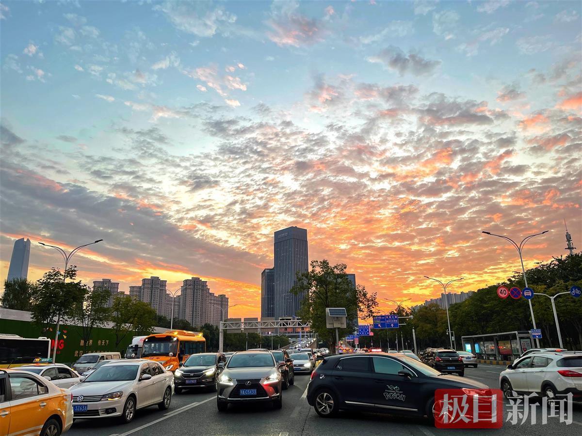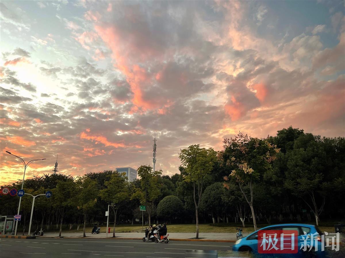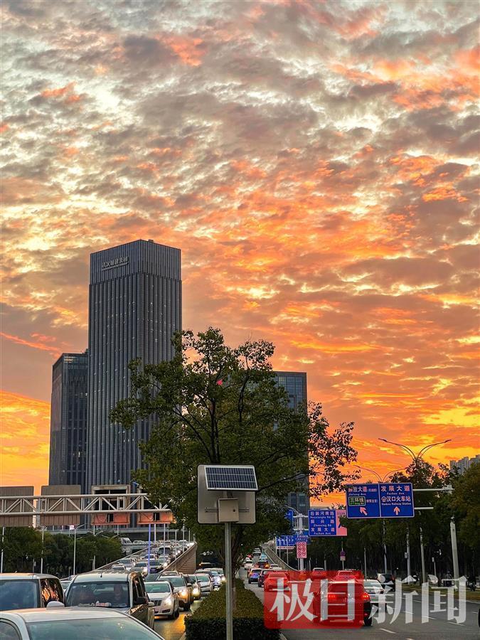 10月18日18时许,太阳没有落山,依旧播洒着金色的光芒,亮红色的光迅猛地融入进云里,像调色板,红彤彤的,气势宏大壮观,引人入胜。