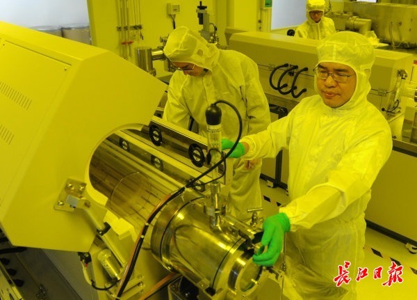 武汉尚赛光电科技有限公司OLED提纯实验室,王磊博士(右)和科研人员在工作。 记者高勇 摄