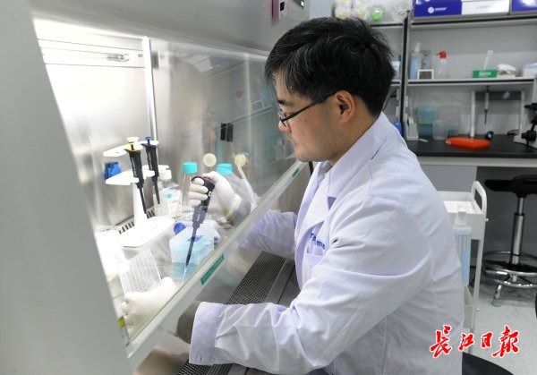 优睿赛思(武汉)生物科技公司总经理吴海博士在B细胞培养实验室进行B细胞原代培养。 记者高勇 摄