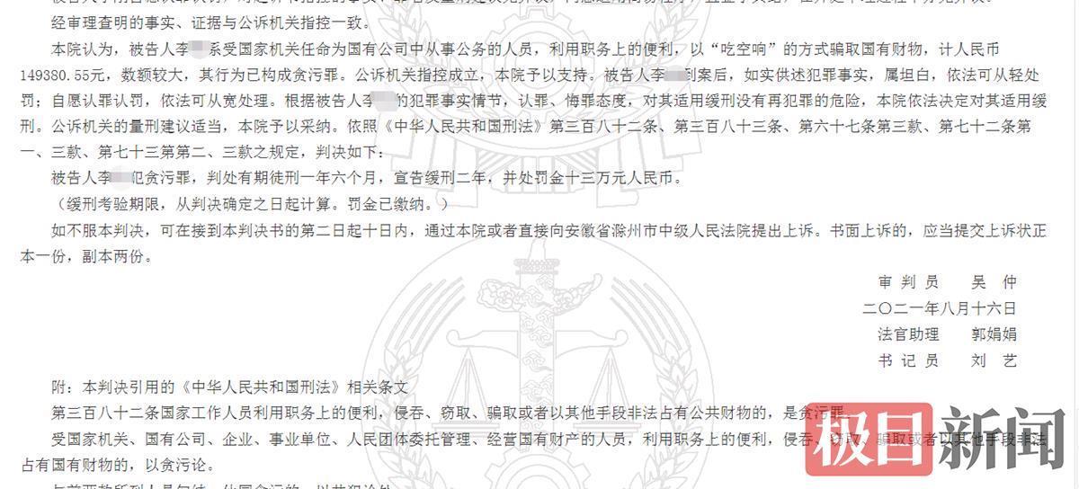 2021年8月16日,安徽省来安县人民法院判决李某犯贪污罪,判处其有期徒刑一年六个月,宣告缓刑两年,并处罚金十三万元人民币。