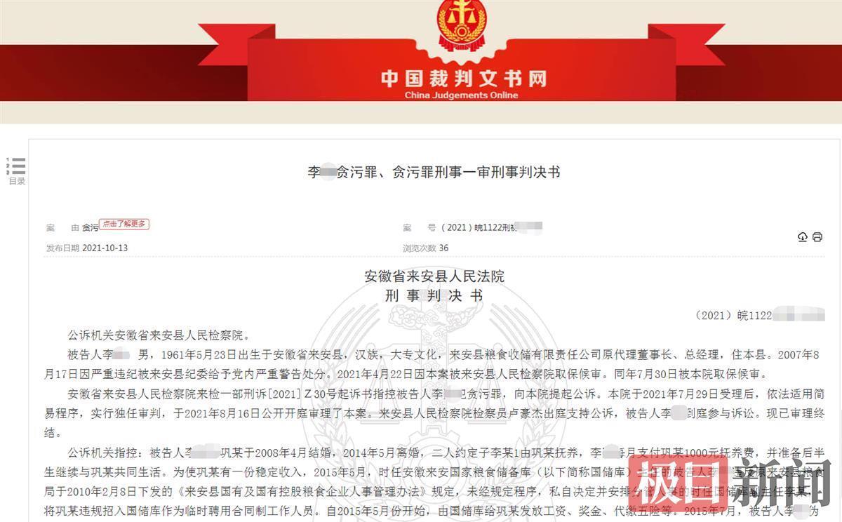 中国裁判文书网发布的判决书显示,1961年5月23日出生的李某曾任来安县粮食收储有限责任公司代理董事长、总经理。2007年8月17日,他因严重违纪被来安县纪委给予党内严重警告处分。