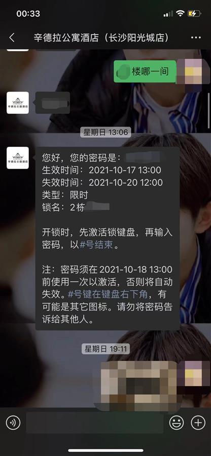据梁女士介绍,10月17日,她和妹妹来到长沙旅游,预订了位于开福区阳光城檀悦2栋内的辛德拉公寓酒店,预订日期为17日至19日三天。入住当晚10时许,姐妹俩听到房间门外传来输入门锁密码的声音,对方还多次转动了门把手,试图开门,她们便来到门口录下视频。所幸房间门由于被反锁未被打开。