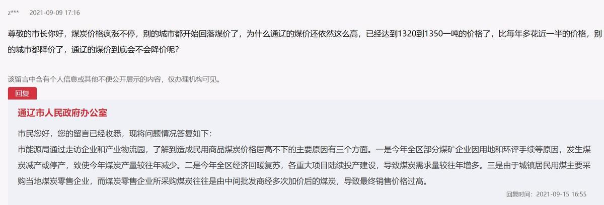 极目新闻记者注意到,早在9月9日,内蒙古自治区通辽市网友曾在人民网留言板咨询煤价问题。通辽市人民政府办公室曾回复称,市能源局通过走访企业和产业物流园,了解到造成民用商品煤炭价格居高不下的主要原因有三个方面:一是今年全区部分煤矿企业因用地和环评手续等原因,发生煤炭减产或停产,致使今年煤炭产量较往年减少;二是今年全区经济回暖复苏,各重大项目陆续投产建设,导致煤炭需求量较往年增多;三是由于城镇居民用煤主要采购当地煤炭零售企业,而煤炭零售企业所采购煤炭往往是由中间批发商经多次加价后的煤炭,导致最终销售价格过高。