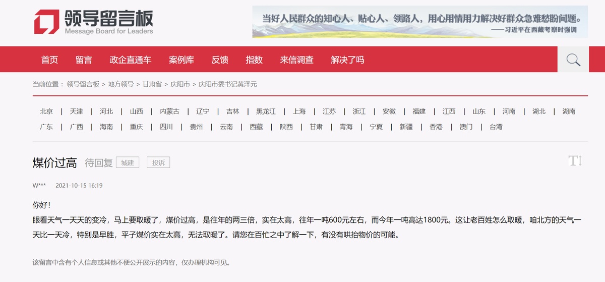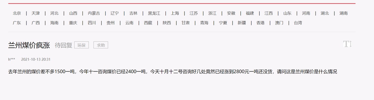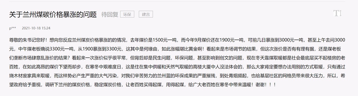 极目新闻记者检索发现,从今年9月开始,就陆续有多名甘肃网友在人民网领导留言板向相关单位反映煤价上涨的问题。其中一名兰州网友反映称去年兰州的煤价为1500元每吨,今年10月初咨询煤价时价格已达2400元每吨,10月12日咨询好几处,煤价竟已涨到2800元每吨,且没有货。