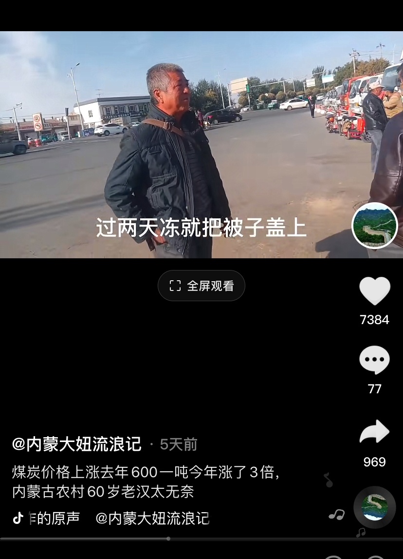 巴彦淖尔一务工人员向抖音博主表示煤太贵了,过两天冷就把被子盖上蹲床上