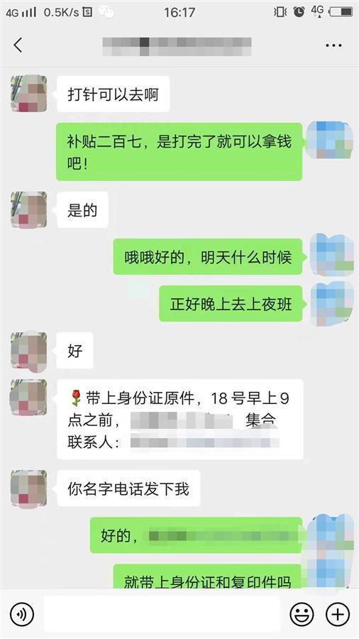 武汉市民张先生(化姓)告诉极目新闻记者,此前他通过朋友加了一个“打疫苗福利群”,群里的中介称可以安排人从武汉出发,乘坐大巴车前往江西九江打新冠疫苗第二针。中介承诺,参与者可以享受“车接车送,包一顿餐,每人补贴270元”。“还有这般好事?”张先生称,他常年在外地,近期才回武汉,心想着自己还没打第二针新冠疫苗,便提交了个人信息,报名参加了。