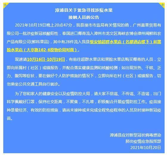 公告称,2021年10月19日晚上20点47分,漳浦县接市市监局有关情况的函,广州嘉果贸易有限公司一批涉疫新冠核酸阳性,泰国进口椰青流入漳州市龙文区海峡农博会漳州闽鲜科农产品有限公司(鲜科果品),其中有28件流入该县绥安镇超群水果店(名都酒店楼下)和黑脸水果店(大亭路162-6原物价局对面)。