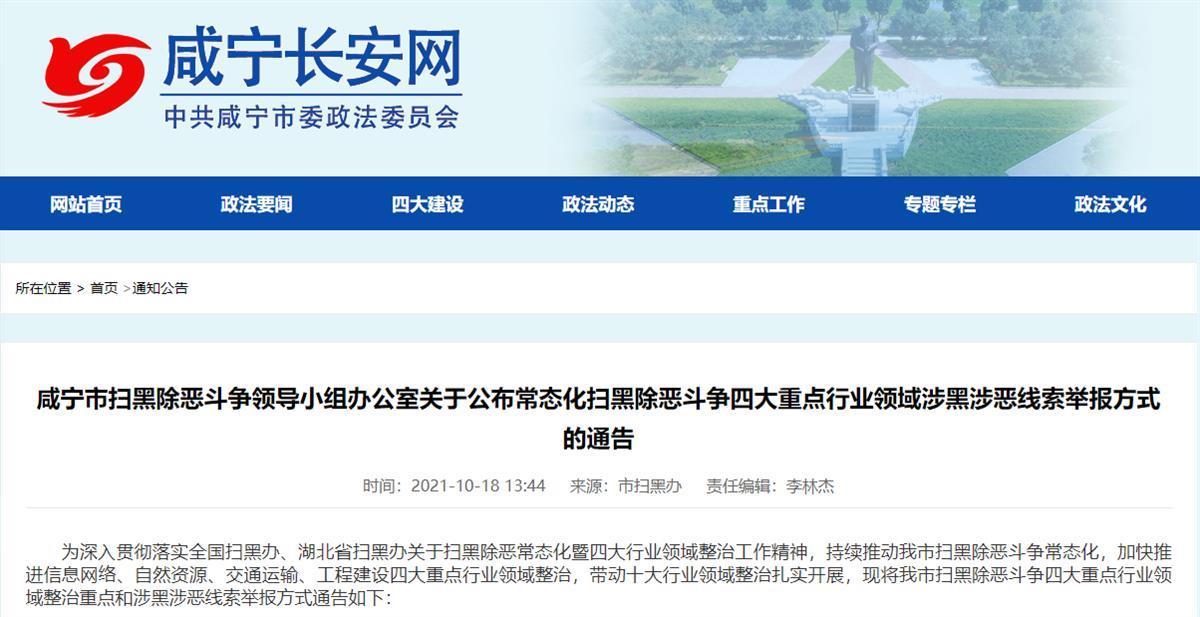 为持续推动咸宁扫黑除恶斗争常态化,加快推进信息网络、自然资源、交通运输、工程建设四大重点行业领域整治,带动十大行业领域整治扎实开展,10月18日,咸宁市扫黑办发布通告,公布四大重点行业领域整治重点和涉黑涉恶线索举报方式。