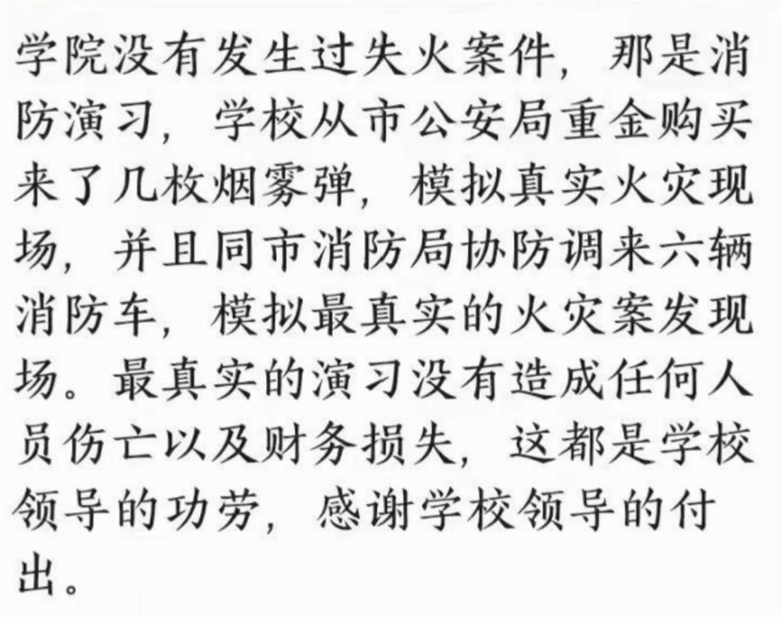 网传信息称,这是河北对外经贸职业学院发生了火灾。也有学生在社交平台称,学校没有发生过失火案件,视频和图片中是消防演习,是学校花重金模拟真实的火灾现场。
